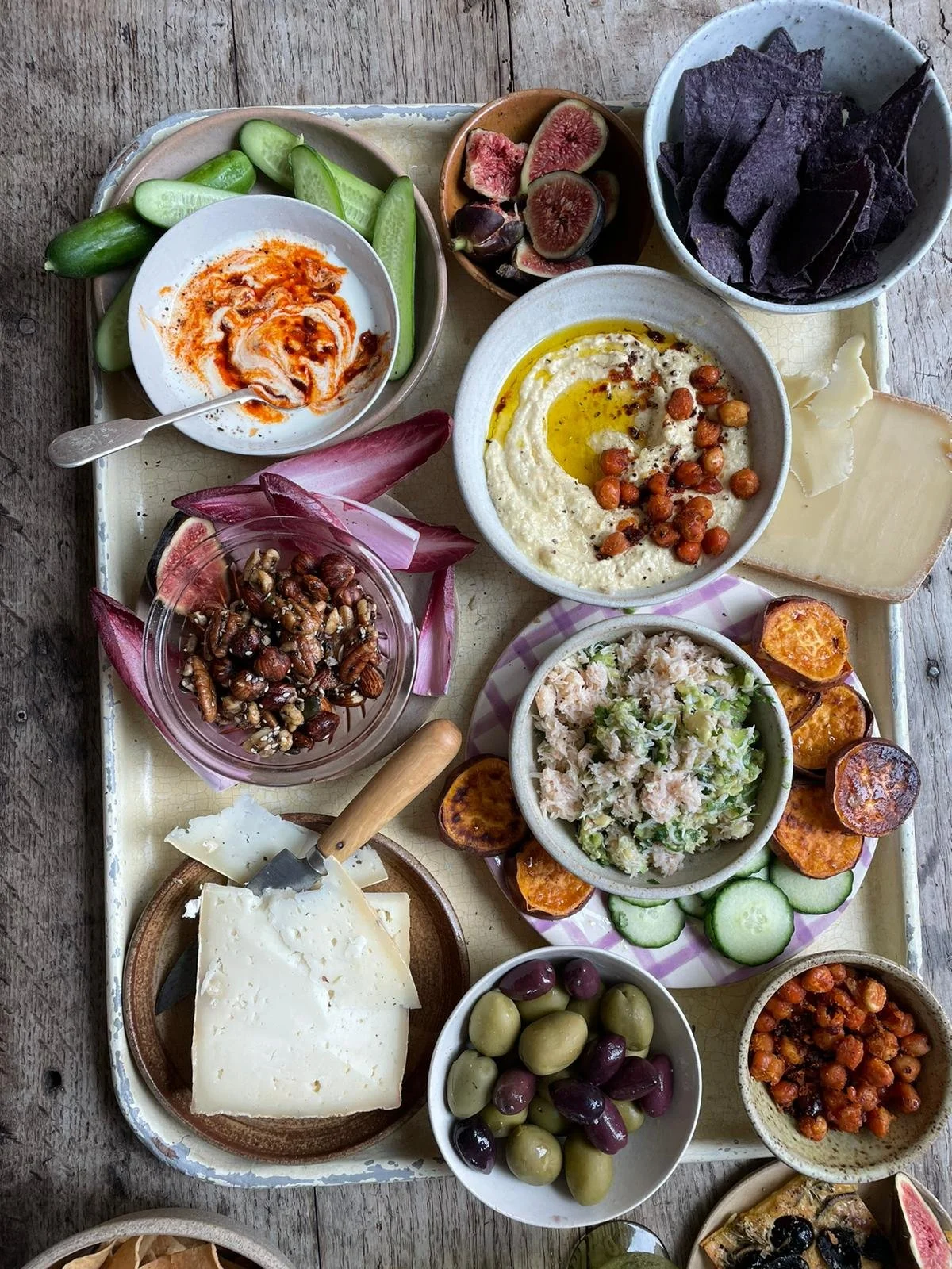 For me, a delicious dip is a fundamental part of sharing platters. I love the whipped feta and harissa honey dip on page 214 of my book Feel Good. Bean-based dips always go down a storm; simply blitz up a tin of beans with garlic, herbs, tahini and olive oil. Top with extra olive oil, chilli flakes and perhaps some crushed nuts. Make sure you have lots of lovely veg and crackers for dunking and scooping.