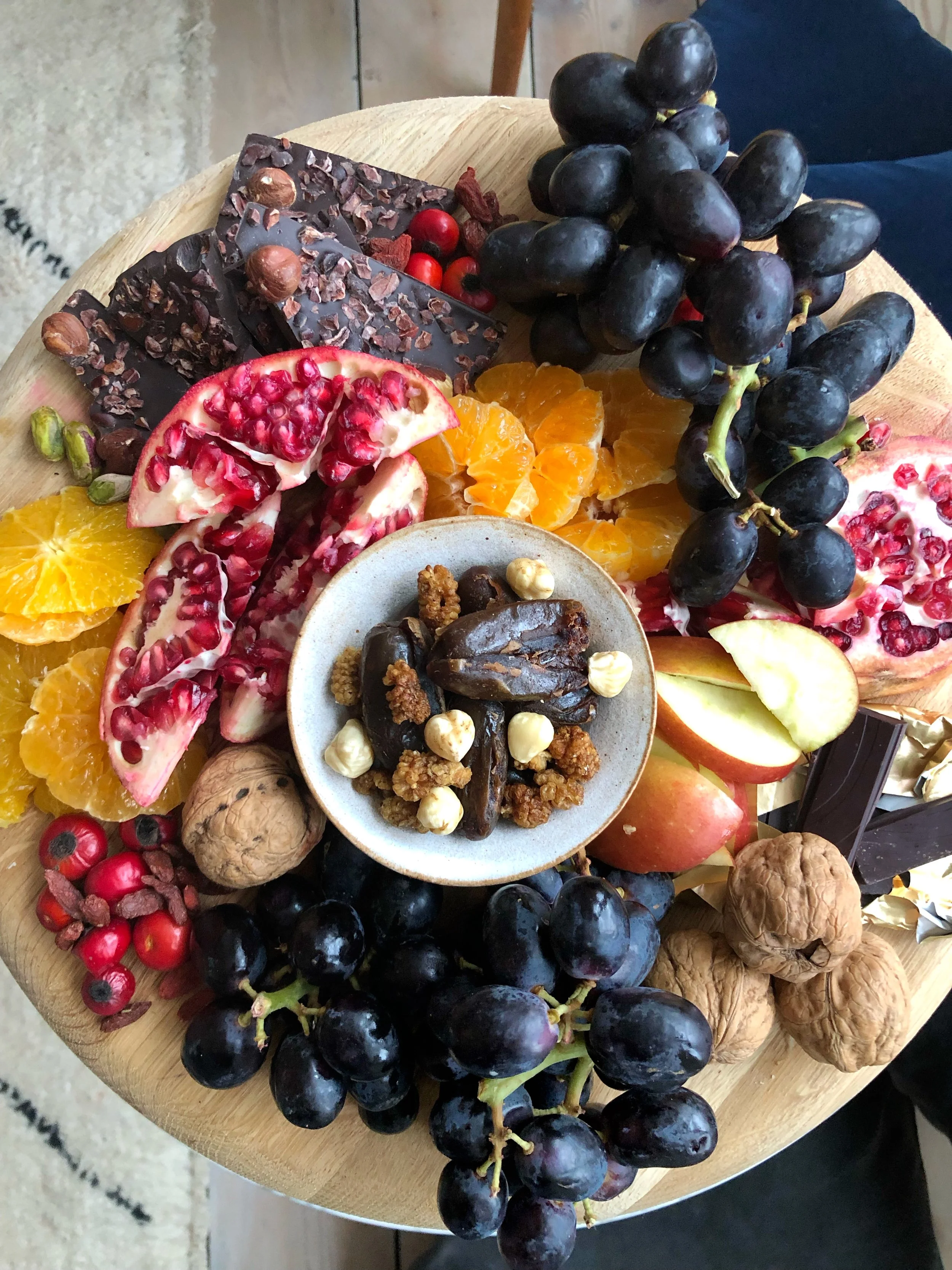 I love to do sweet platters as well as savoury, including a selection of chocolate (dark, milk and white so that everyone is happy!), seasonal fruit and nuts. If you can get hold of nuts in their shell, they look great and there’s something very satisfying about using a nut cracker!